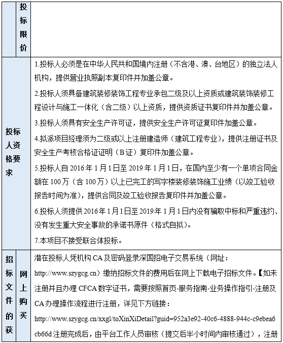 金年会大厦19层总部办公室区域改造装修工程(项目名称)招标方(招标人)为深圳市金年会(集团)有限公司(招标人单位名称),采购资金来自企业自筹(资金来源),项目出资比例为100%。项目已具备招标条件,现进行国内公开招标。