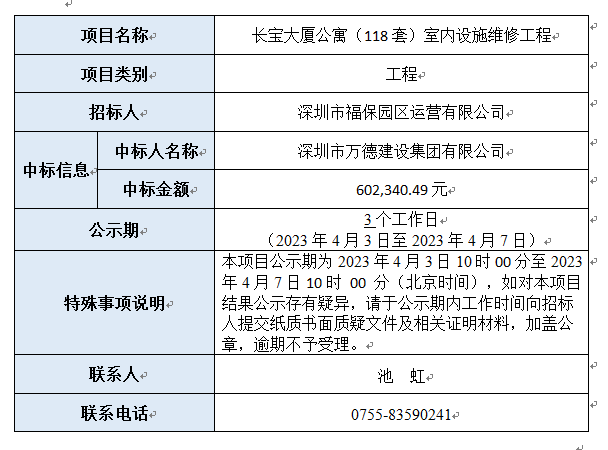 长宝大厦公寓(118套)室内设施维修工程已完成评审,现将本项目评审的相关情况及结果进行公示,具体内容如下: