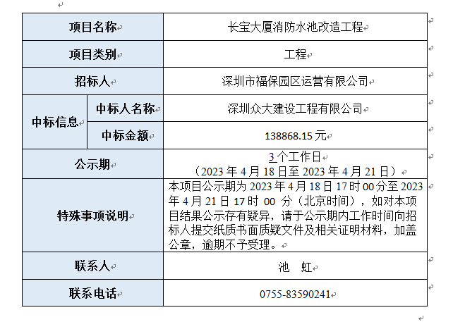 长宝大厦消防水池改造工程已完成评审,现将本项目评审的相关情况及结果进行公示,具体内容如下: