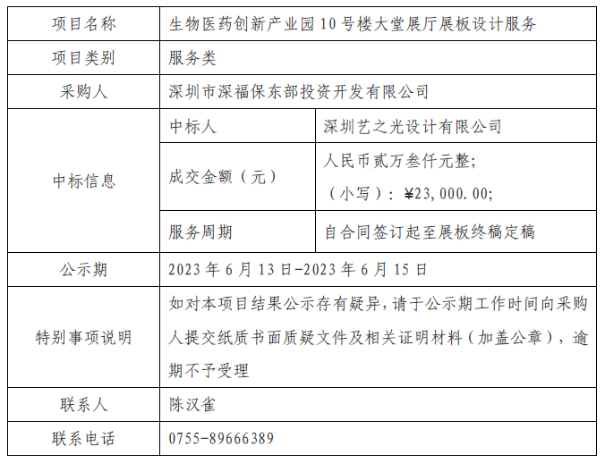 在深圳市建设工程材料设备询价采购平台进行公开招标的生物医药创新产业园10号楼大堂展厅展板设计服务(项目编号:SZXJCG-S202305180007001)已完成评审及定标,现将本项目评审的相关情况及中标结果进行公示,具体内容如下: