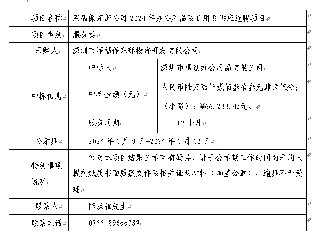 在深圳阳光采购平台进行公开招标的金年会东部公司2024年办公用品及日用品供应选聘项目已完成评审及定标,现将本项目评审的相关情况及定标结果进行公示,具体内容如下: