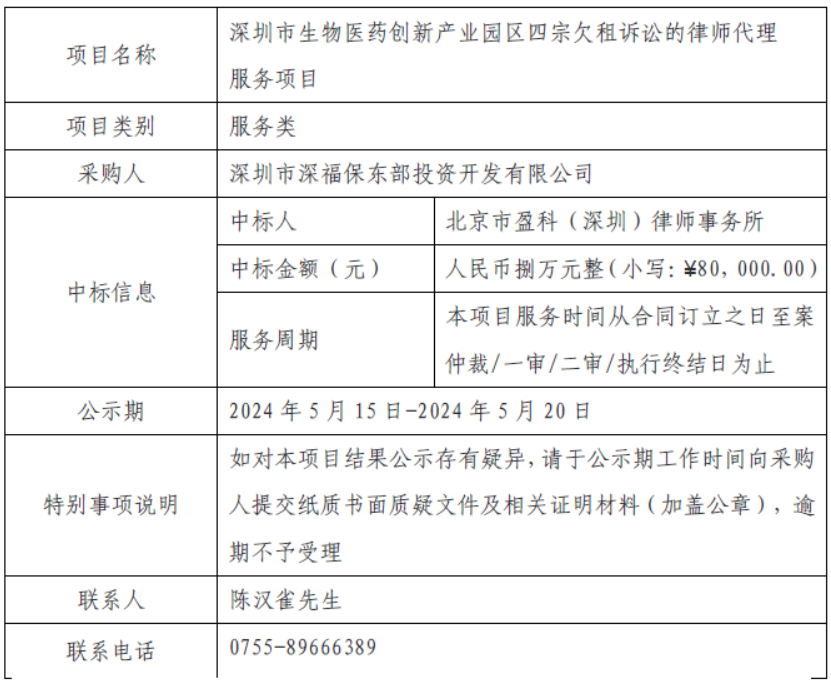在深圳阳光采购平台进行公开招标的深圳市生物医药创新产业园区四宗欠租诉讼的律师代理服务项目已完成评审及定标,现将本项目评审的相关情况及中标结果进行公示,具体内容如下: