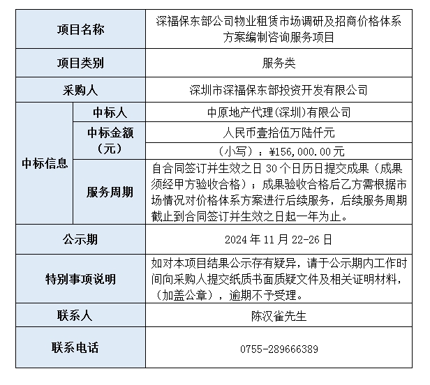 在深圳市阳光采购平台进行公开招标的金年会东部公司物业租赁市场调研及招商价格体系方案编制咨询服务项目(项目编号:241BA0275962)已完成定标,现将本项目定标结果进行公示如下: