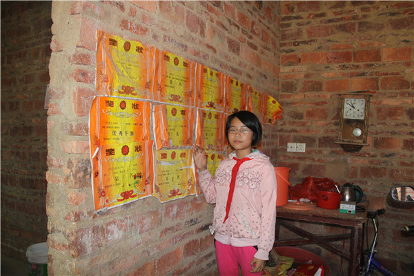 其实这都不是个案,在长期的跟踪管理及家访中,我们发现助学孩子中90%都是留守儿童,50%为单亲家庭,今年孤儿已增至4人,他们兄弟姐妹大都4、5个,老人年迈,部分父母或身有残疾,或患精神病,或丧失劳动力,许多靠种农田或打打小工勉强维持生计。困难虽如此,但助学的孩子们却依然坚强而努力,面对墙上贴满的一张张奖状,我们又怎么能不为他们自豪呢?