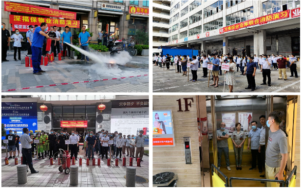 物业公司联合园区公司、万乘公司、保安公司、天津公司等相关单位开展消防安全演练及电梯困人应急救援演练。